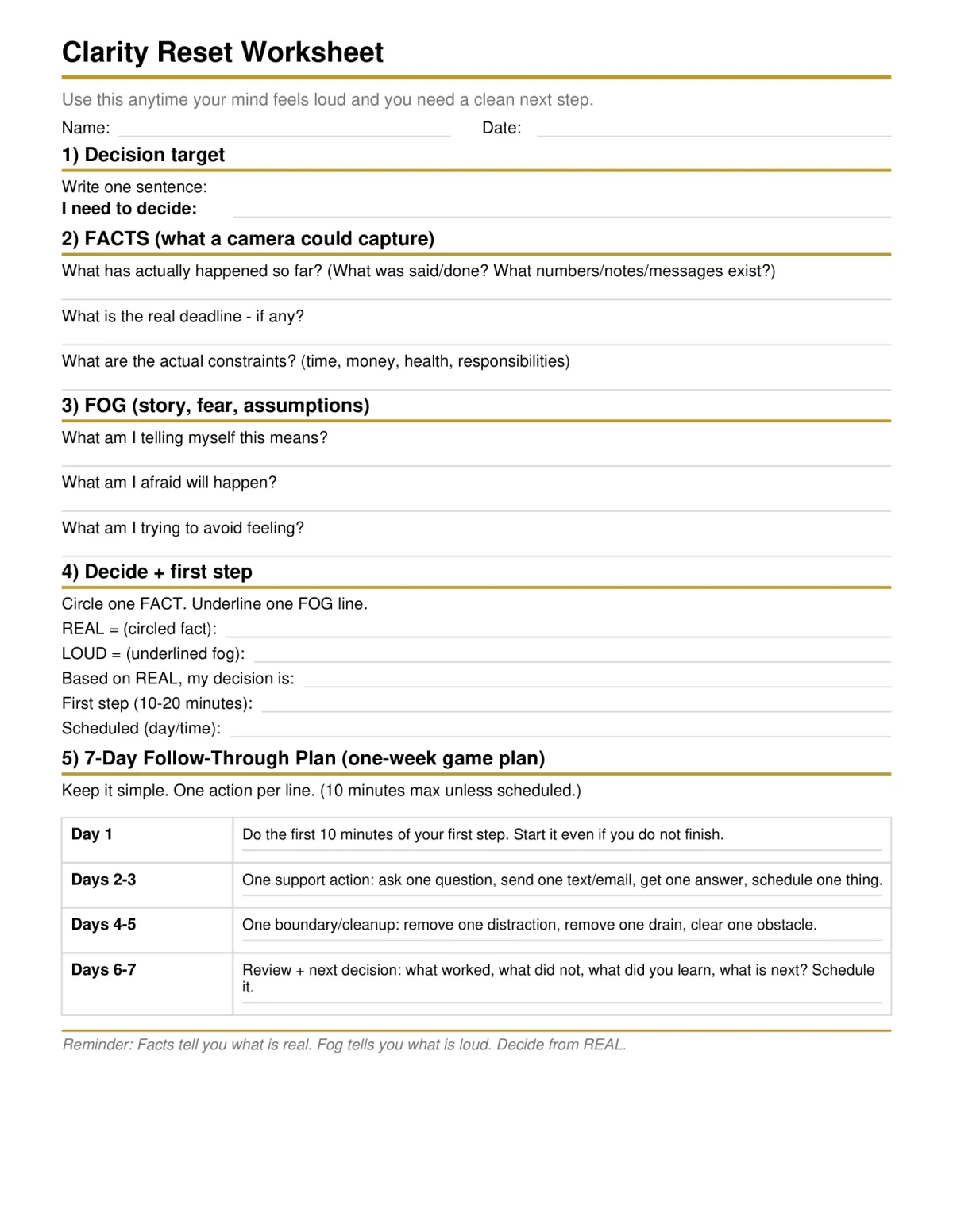 In this $47 Live Clarity Reset (60 minutes on Zoom), I won't hype you up and send you back to real life with nothing. I'll guide you through the same clarity process I use to quiet the mental noise, choose one clear priority, and turn overwhelm into a simple plan-even if you're short on time, carrying a lot, or afraid of choosing wrong.
